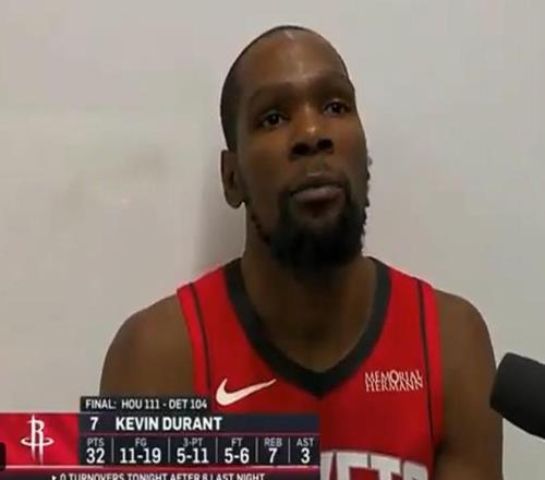 北京时间今日,在NBA常规赛中,休斯顿火箭队在客场以111-104击败了底特律活塞队,终结了对方的四连胜。赛后,火箭球星杜兰特接受了采访。